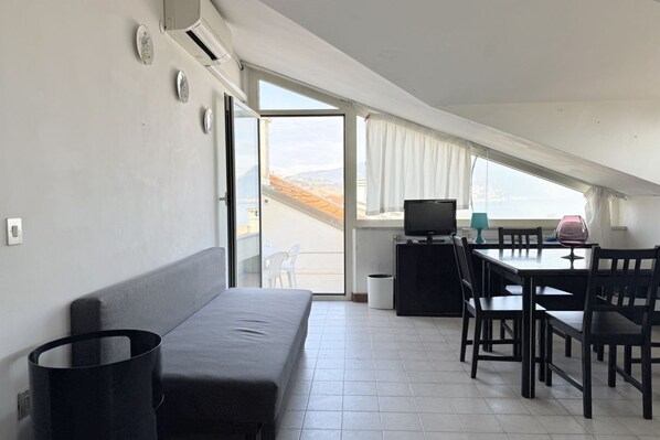 Living room with direct access to the terrace with double sofa-bed and dining table - separate kitchen - double bedroom - second bedroom with bunk bed - bathroom with shower cubicle and washing machine - wonderful sea view terrace equipped with table and chairs. Air conditioning in the living room. Private parking.