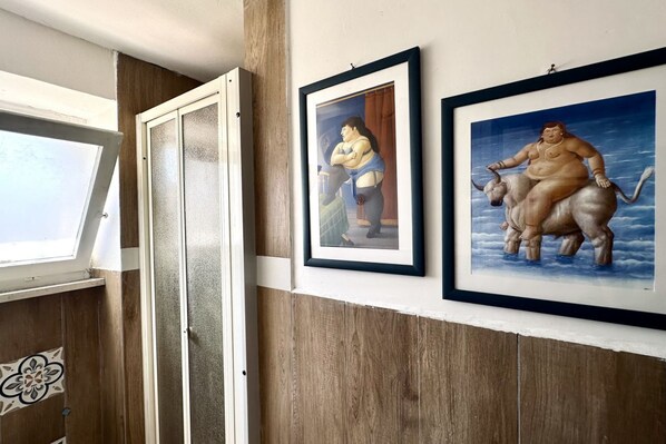 Upper floor: double bedroom - small bedroom with 2 single beds - bathroom with shower and washing machine - wonderful sea view. Pets not allowed.