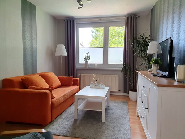 The fully and comfortably furnished holiday home is 36 m² in size and can accommodate up to 4 persons. The accommodation consists of a living room with sofa bed, flat screen TV, radio and a small kitchen with electric stove (no oven), refrigerator, coffee maker, toaster, kettle and food slicer. The bedroom has a double and a single bed. Your bathroom consists of shower and toilet. It is a Non smoking cottage. You will find a parking space behind the house. The garden use with a cozy terrace and barbecue is also given. In front of the cottage is a garden bench. Here you can sit and listen to the small stream behind the house while splashing. As a welcome, a small welcome pack awaits you.