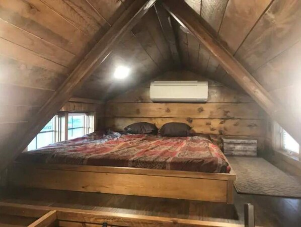 This Tiny Home has a queen size bed in the loft and full size sofa couch on the main floor. There is a TV in main living area with HDMI cable for laptop/computer. There is a microwave/convection oven, cooktop, and refrigerator. A small dining table with two chairs. The home is heated and cooled with a mini-split.