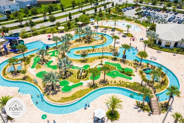 FREE Clubhouse & WATERPARK amenities: Heated Pool, Hot Tub, Kids Splash Zone, Water Slides, Lazy River, Gym, Tiki Bar, Ice Cream Shop & more.