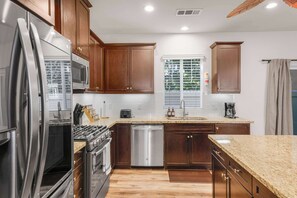 As you step inside, you'll be greeted by a bright, airy open-concept layout with tasteful, neutral design elements. The spacious living room is the ideal place to unwind, featuring a comfortable queen-sized pull-out sofa and a large 55-inch smart TV. The fully stocked kitchen is a chef's dream, complete with sleek stainless steel appliances and everything you need to prepare meals. The adjacent laundry room and a convenient ground-floor bedroom and bathroom add to the home's practical design.