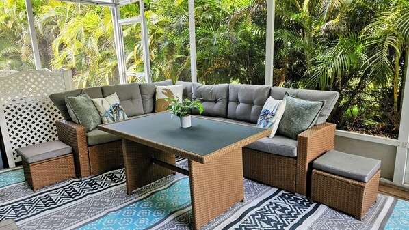 Your cottage also has its own lush, private, screened lanai surrounded by palms, with string lights, lounging for 6, and Bluetooth speaker so you can dine, play games and enjoy your own music in privacy, day or night.