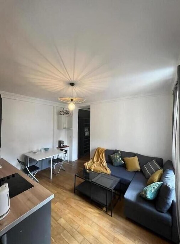 Nestled in the La Goutte d'Or neighborhood, Rue Doudeauville offers a serene retreat from city life with its courtyard view and garden surroundings. Unwind in the cozy living space featuring a kitchen, dining area, and sofa bed.