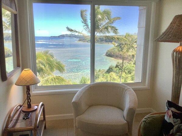 The view from your lanai reaches all the way down the Anini reef to the lighthouse at Kilauea. The shaded lanai with seating for two is perfect for morning coffee, an informal al fresco dinner, or a quiet hour with a good book as you're cooled by the ocean breezes. The comfortably furnished living room has a vaulted ceiling, an oceanfront reading nook, and tasteful Hawaiian decor. Unobstructed views from the living room and bedroom include distant mountains, waterfalls, glimpses of Bali Hai, and unending ocean in variegated shades of blue. This Kauai vacation rental is the perfect home away from home.