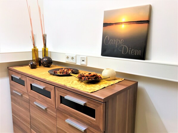 The kitchen is spacious and fully equipped - with an oven, stove, fridge with freezer compartment. Microwave, coffee maker and kettle and everything else you need is available.