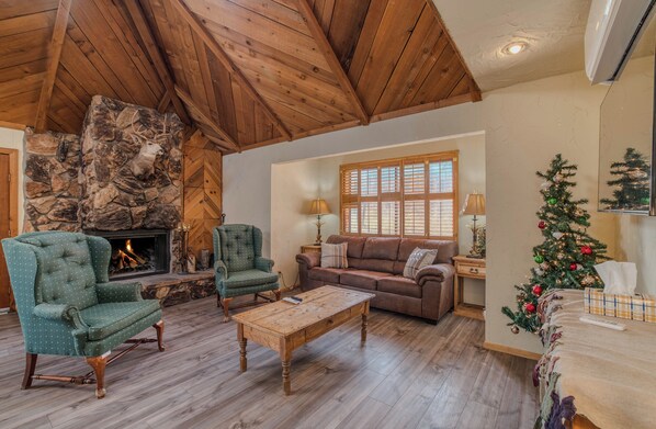 The centerpiece of "O'Deer" is its magnificent stone fireplace, a testament to the cabin's commitment to warmth and comfort. It beckons you to gather around its hearth, sharing stories and laughter in its timeless glow.