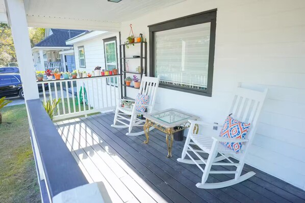 Enjoy a spacious front porch and fenced backyard boasting a fire pit, picnic table, & lounge chairs.