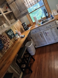 It was very nice, beautiful, as described. Coupons available that we used, plenty of fridge space, some seasonings, cute guest book. Nice hot tub. Perfect place for couples.We requested an early check in and were told that was not possible so we explored gatlinburg until our check in time cameThe cabin was unfortunately not ready upon check in. We walked in the cabin and were surprised to find towels, trash bags, things everywhere, and then the cleaner came from the back porch which we also didnt expect. I thought maybe we were in the wrong place.The cleaner was very sweet and appologetic, we just dont know what was going on. We were not early or anything but she seemed to think that 4:00 was not supposed to be check in time despite what our booking info said.We ended up helping with cleaning so we could get settled quicker and start our last days of our anniversary trip.After that everything was fine and it was beautiful.