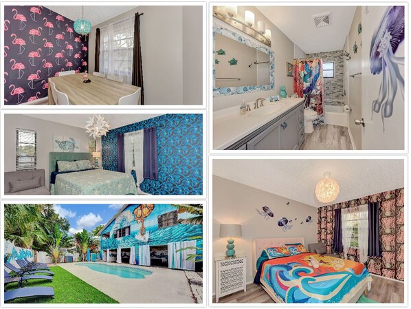 Experience luxury & comfort in this 4BR 3BA Siesta Key duplex, just steps from the beach entrance along iconic Beach Road. This private getaway features trendy interiors, fully equipped kitchens, spacious living areas & a spectacular backyard with a private saltwater pool, two cabanas with hot tubs, BBQs & vibrant murals. Perfect for families, groups, & friends seeking fun & relaxation in a prime Gulf Coast location.