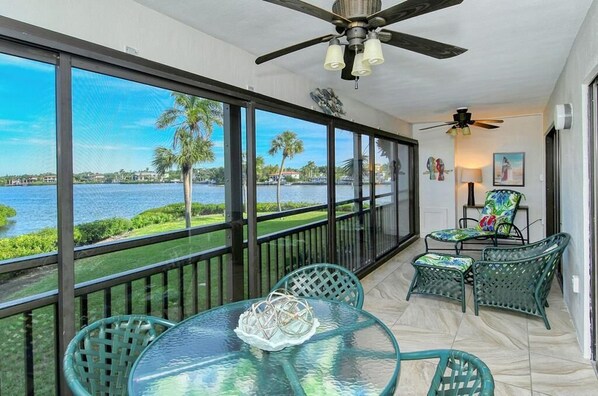 This 2 bedroom, 2 bathroom unit features an amazing view of Sarasota's Inter-Coastal Bay. This unit sleeps a maximum of 4 guests. Enjoy this amazing view while sipping coffee in the morning watching the boats go by or while having dinner out on the screen enclosed lanai. This unit has an open floor plan from the living room to the kitchen. You can enjoy the Bay view from the comfy sofa while also watching your favorite show on a flat screen TV. The large, eat-in kitchen was updated in 2016 and has updated appliances. The guest bedroom has 2 twin beds, closet space for 2 people and a TV. The guest bathroom has a tub/shower. There is a washer and dryer in the unit for your personal use. The master bedroom has a King size bed, flat screen TV, large walk-in closet space and a view of the Bay. The master bathroom has a walk in shower and updated vanities with his & hers sinks. Only a few minutes' walk to pool, tennis courts, and our private white sand beach; equipped with chairs & umbrellas. Complimentary Cable TV, phone service and Wi-Fi in unit. 2 Heated Pools, 2 Lighted, Private Tennis Courts, BRAND NEW Fitness Center, Newly Remodeled Clubhouse with Computer, Printer and Wi-Fi, Beach Attendant with complimentary use and set-up of beach loungers and umbrellas 7 days a week! Enjoy your vacation in one of the premier units at Midnight Cove!