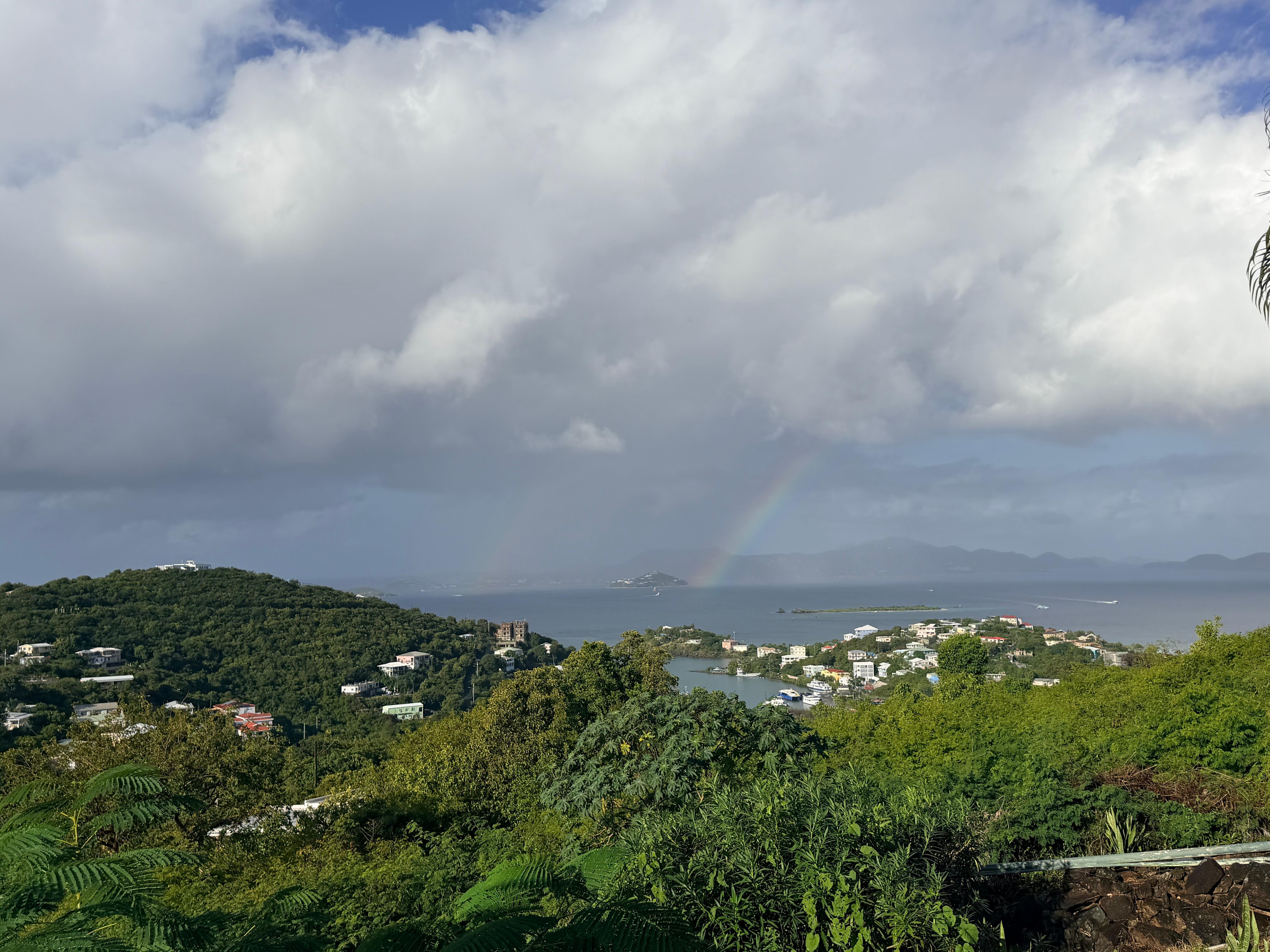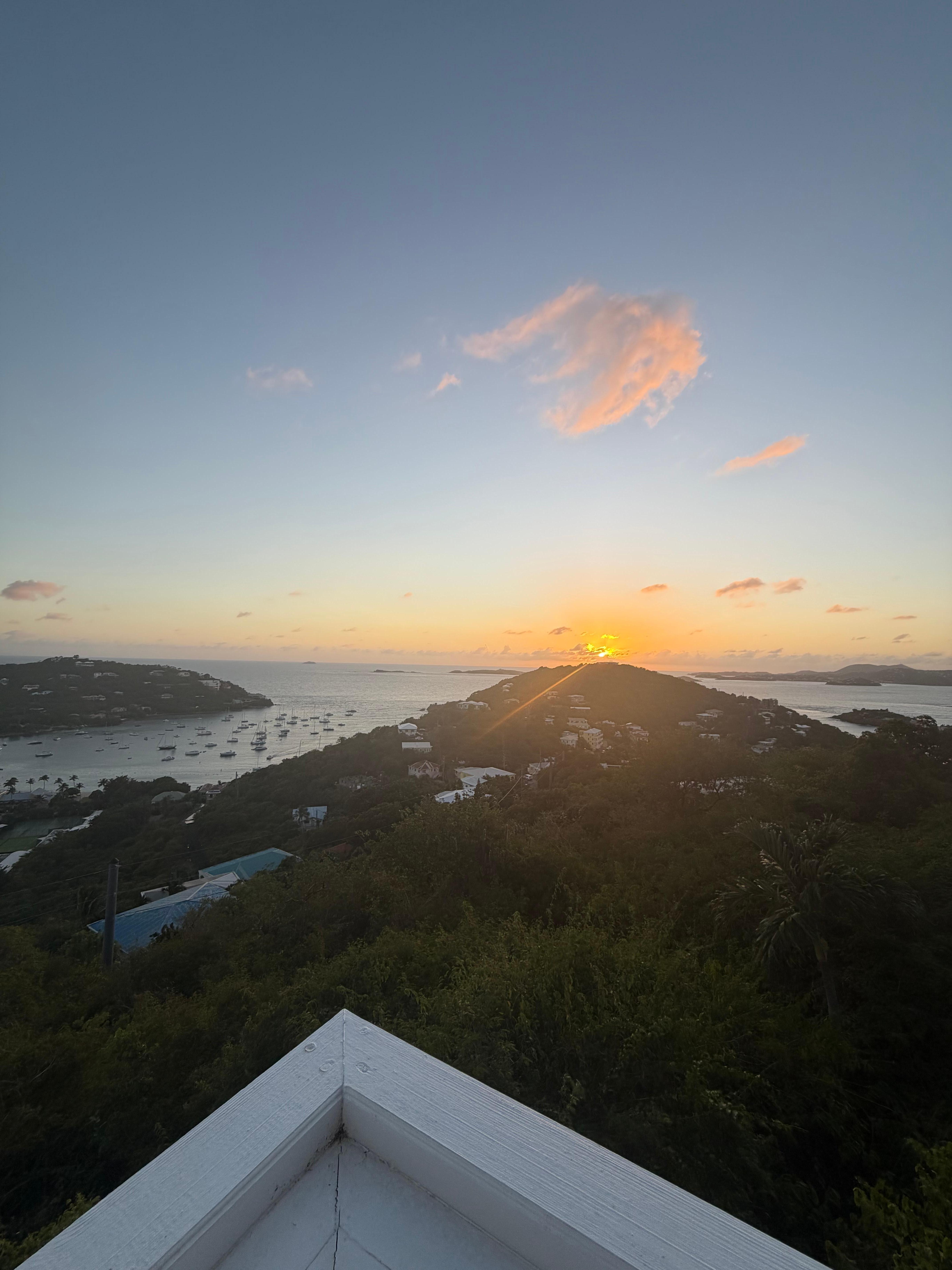 Bliss is one of St John's unknown secrets with amazing panoramic views of the Caribbean Sea, St Thomas, St Croix (on a clear day) to various other islands and cays. Beautiful Sunsets and Rainbows right from the deck! Located just above the Westin Resort in Great Cruz Bay, this villa is 3 minutes from Cruz Bay, the grocery stores, restaurants, shopping, hiking trails and much more! Bliss is a two level, one bedroom, one bath condo featuring custom sliders in both living and bedroom areas to capture the largest ocean view from any room. The Living Room has a Sleeper Sofa. The large wrap around deck features covered and uncovered areas for sunbathing, shade and outdoor dining. Cool breezes surround and stunning sunsets are an every night spectacle you won't want to miss! It has absolutely everything you could possibly need to pamper yourself, including full kitchen with stainless refrigerator, dishwasher, gas cook top, oven, microwave, coffee maker, toaster and blender. Feel like a Queen (or King) in Bliss' complete marble bathroom, large marble walk in shower, mirrors and lots of space to move around. The living area is fully equipped with sleeper sofa, leather ottoman, satellite TV & A/C wrapped around by blue sky. Spiral staircase leads up to the master bedroom which features King size "Heavenly Bed" with A/C. And a communal pool just steps away from the villa! This is your time and these memories will last a life time....remember them in Bliss!