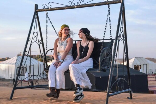 Desert Starry Dunes Luxury Camp in Erg Chebbi Merzouga offers camel rides at sunset, a traditional Berber dinner under the stars, and live music around the campfire. Enjoy spectacular desert sunrises and a hearty breakfast before your journey back across the dunes.