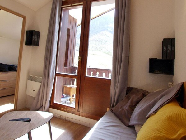 - 1 Living room, dining area with pull-out bed, TV, storage cupboard and exit to SOUTH Balcony