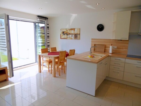The open, very chic kitchen leaves nothing to be desired. At the comfortable dining table you can dine in peace and with a view of the garden.