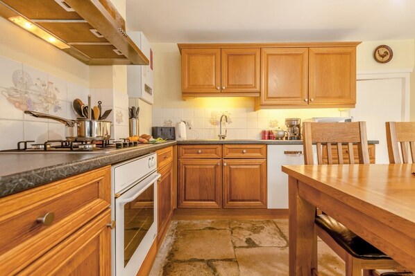 - Electric oven, gas hob, fridge/freezer, microwave and dishwasher