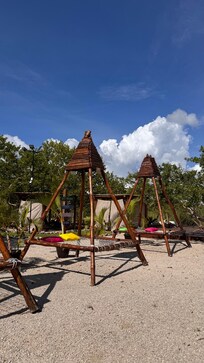 Tienen un club de playa padrísimo que me doy 10/10, nos la pasamos todo el día ahí súper a gusto, ya que tiene zona tanto bajita como profunda, hay columpios hamacas, muelle con diferentes alturas para brincar, etc.