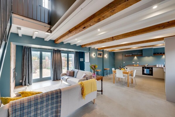 Whisk away your small family or the other half plus one canine companion to this elegant and bright converted 200-year-old barn set on a small farm with characterful original features and a sociable open-plan living area. Meet the farmyard horses, ducks and sheep, and take advantage of the onsite games room and the nearby delights – such as nature reserves, a vineyard, and the historical city of York.